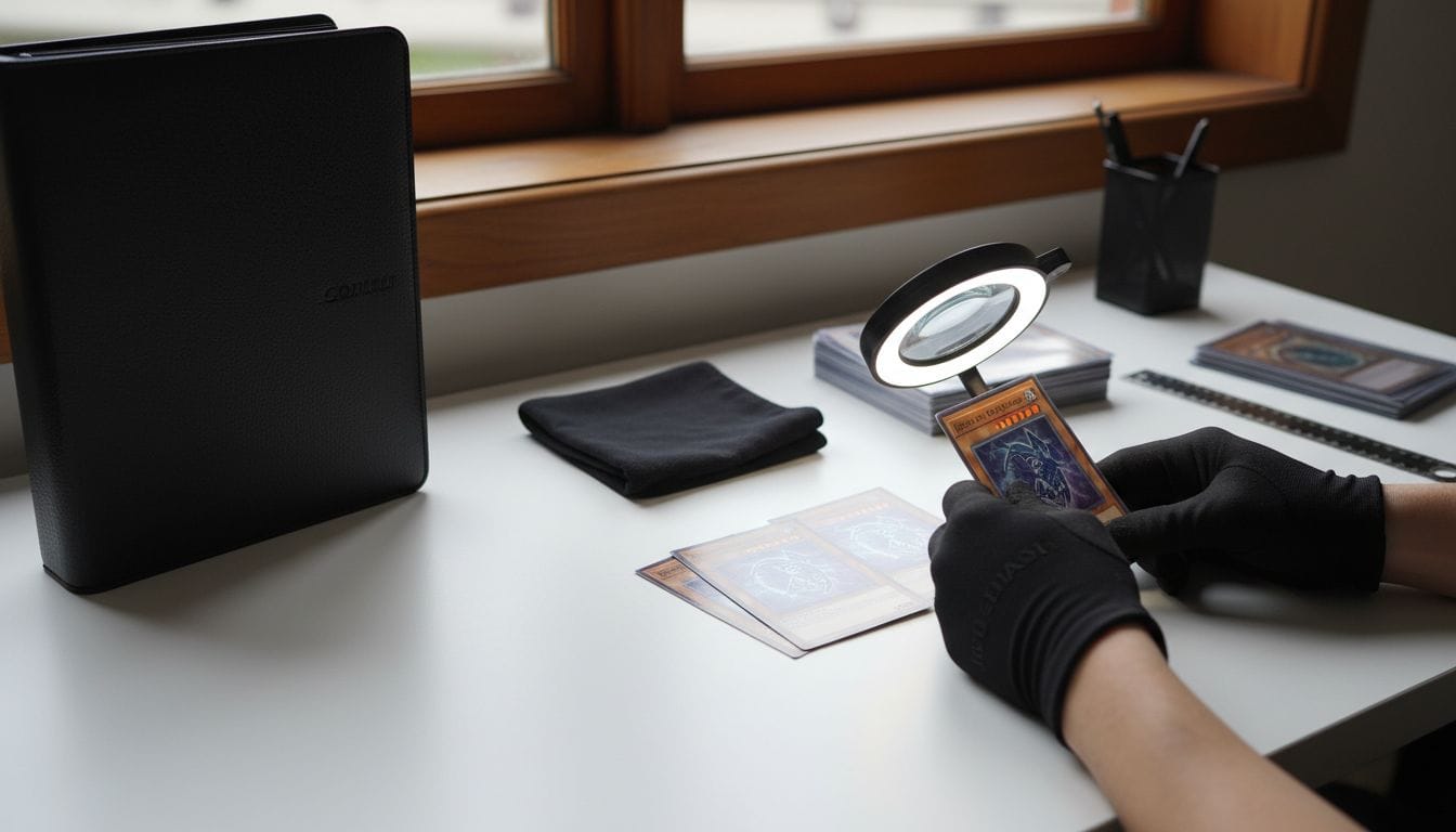 Pour évaluer vos cartes Yu‑Gi‑Oh, installez-vous dans un espace propre et bien éclairé avec une table stable. Rassemblez des outils comme une loupe, des gants en coton et une règle pour faciliter l’examen minutieux de vos cartes.